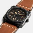 The black dial of the BR-03 Heritage is beautifully contrasted by beige numerals and markers, ensuring optimal readability in various lighting conditions. The use of Swiss Super-Luminova® on the hands and markers adds a practical touch, providing visibility even in low light. The iconic square case, a signature design element from Bell & Ross, gives this timepiece a distinct and timeless aesthetic, making it stand out in any collection.