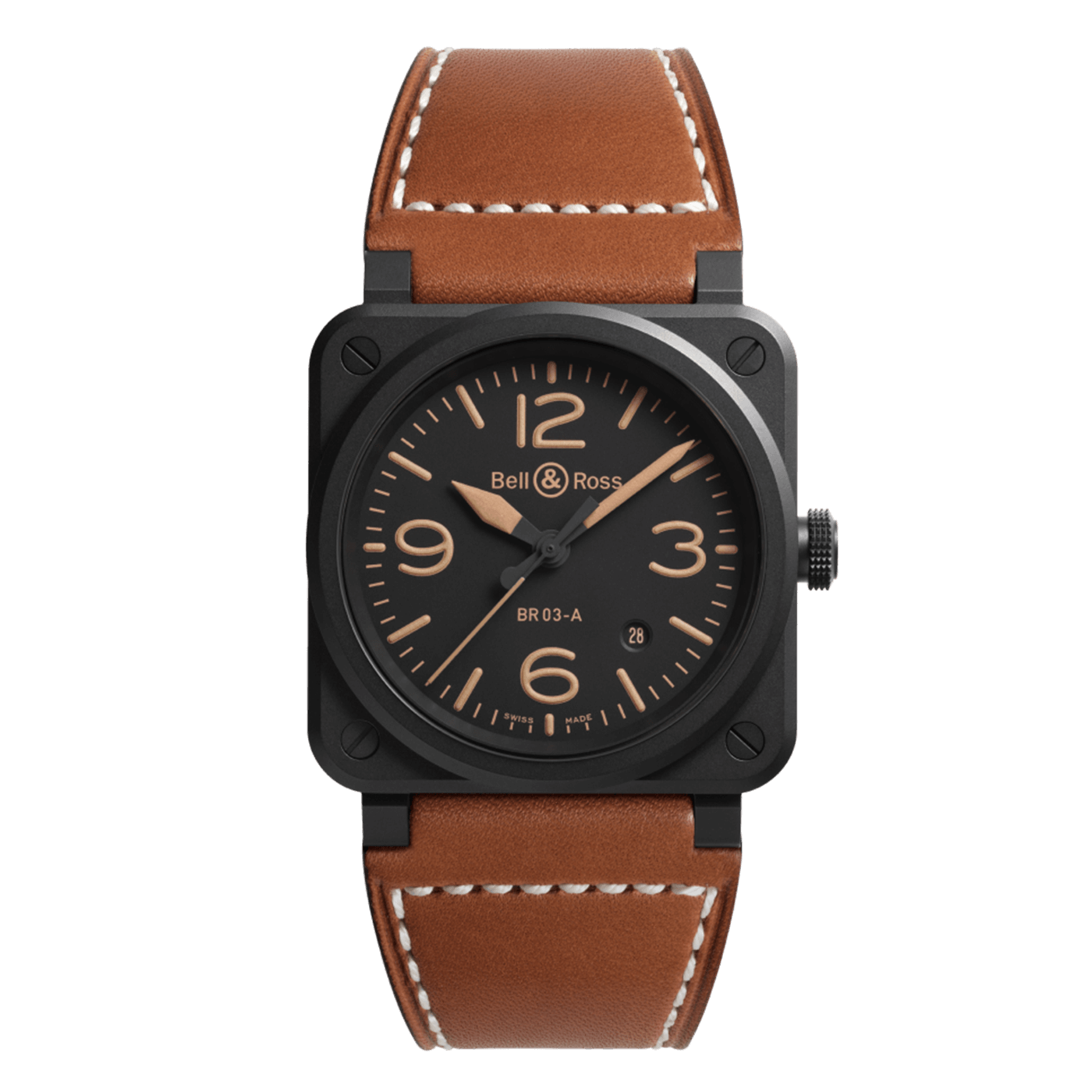 The Bell & Ross BR-03 Heritage BR03A-HER-CE/SCA is an exceptional timepiece that seamlessly merges the world of aviation with luxurious watchmaking. With its bold 42mm ceramic case, this watch is not just a tool for keeping time—it's a statement piece, designed for those who appreciate both function and style. The watch draws inspiration from the design elements of military aviation instruments, giving it a robust, utilitarian feel, while maintaining a refined elegance that is perfect for both everyday wear and formal occasions.