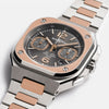 The Bell & Ross BR 05 Chrono Grey Steel & Gold is a commanding expression of contrast and craftsmanship, uniting the strength of steel with the luxurious glow of rose gold. Its 42mm case features a sophisticated blend of satin-polished stainless steel and 18K rose gold accents, while the integrated steel and gold bracelet reinforces its architectural presence and fluid wearability. This two-tone construction makes a bold statement—modern yet timeless. The centerpiece is the sunray ruthenium dial, a rich grey tone with a metallic shimmer that shifts with the light, delivering a sense of depth and drama. Two gold-ringed chronograph subdials balance function with form, while Super-LumiNova®-filled hands and indices ensure visibility at all hours. A rose gold chronograph seconds hand adds warmth and elegance, perfectly complementing the dial’s moody brilliance. Framed by an 18K rose gold bezel, the composition feels both sporty and refined. Driven by the reliable BR-CAL.301 automatic movement, the BR 05 Chrono Grey Steel & Gold offers 42 hours of power reserve and is visible through a transparent sapphire case back. It’s a watch for those who appreciate bold contrasts—luxury fused with utility, sophistication paired with performance, all wrapped in a timepiece that doesn’t just complement your style but defines it.
