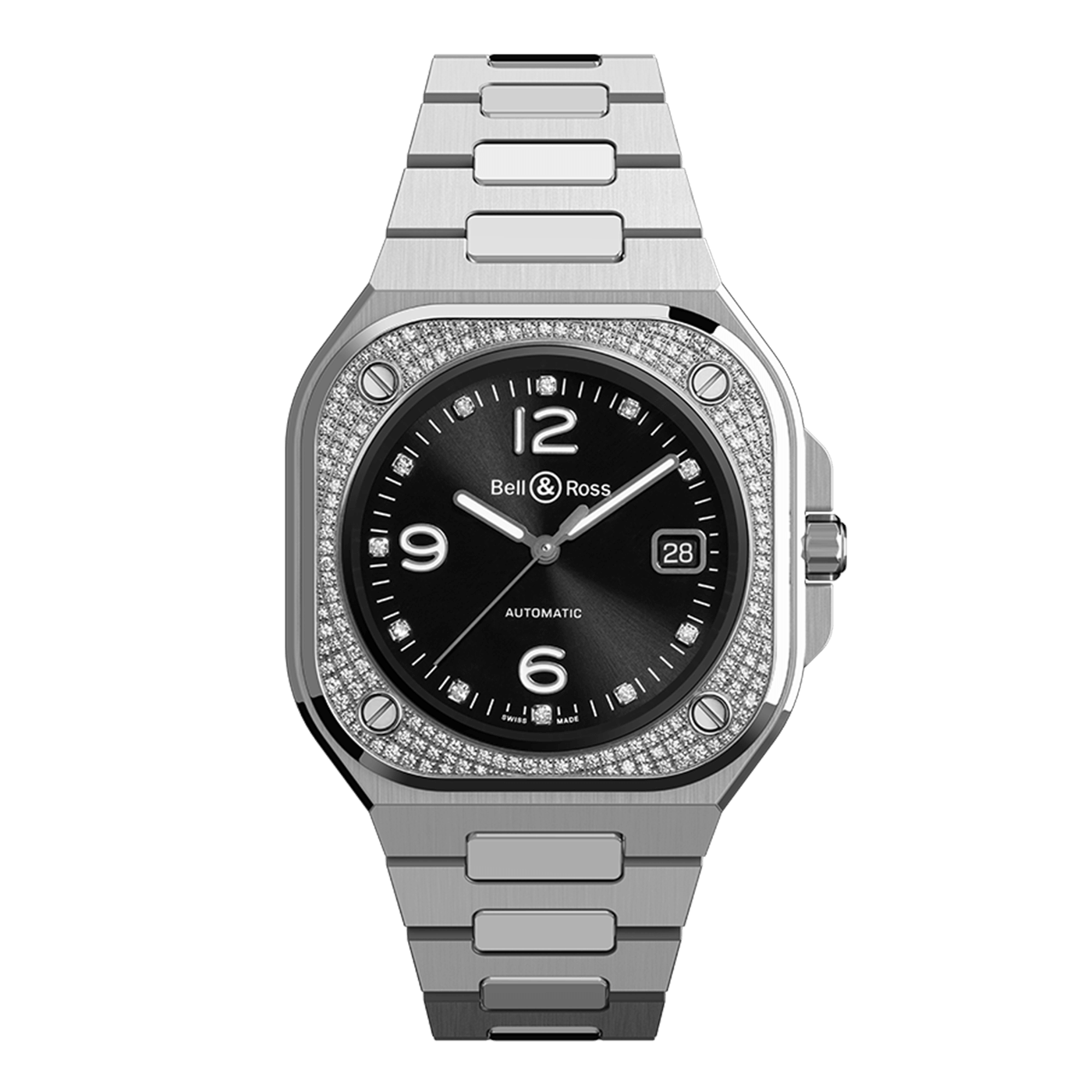 The Bell & Ross BR 05 Diamond is a refined blend of watchmaking precision and modern elegance. Encased in a 40mm rounded-square satin-polished stainless steel case, this timepiece makes an immediate impression with its bold form and luxurious detailing. The bezel is set with 172 brilliant-cut diamonds (0.88 ct), offering a radiant contrast to the industrial-chic structure of the BR 05, and elevating it into the realm of high-end sophistication. Its black sunray dial brings depth and drama, enhanced by 11 diamond hour markers that sparkle subtly with each movement. Large Arabic numerals at 6, 9, and 12 o’clock add balance and legibility, while Super-LumiNova® on the hands ensures visibility in low light. The skeletonized hands, polished steel accents, and a date window at 3 o’clock complete the look, all protected by a sapphire crystal with anti-reflective coating. Inside, the watch is powered by the BR-CAL.321 automatic mechanical movement, offering a reliable 38-hour power reserve. A transparent sapphire case back reveals the movement in motion, adding a technical dimension to the luxury aesthetic. Fitted with a satin-polished stainless steel bracelet, the BR 05 Diamond is the perfect timepiece for those who want the sparkle of diamonds wrapped in a bold, contemporary silhouette — elegant enough for evening, yet confidently modern for everyday wear.