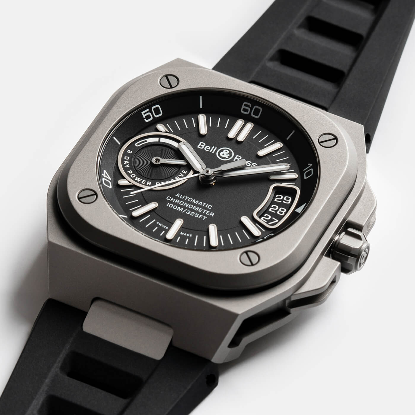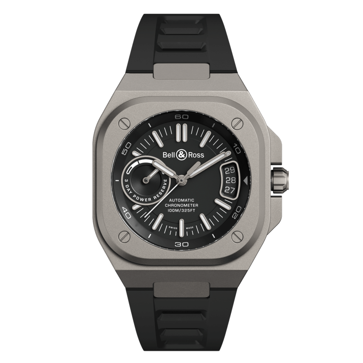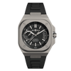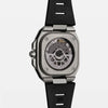 The Bell & Ross BR-X5 Black Titanium blends modern design with technical excellence, offering a lightweight, durable, and refined timepiece for daily wear. Its 41mm case, made from grade 2 titanium with a satin-polished finish, delivers strength without the bulk, making it comfortable on the wrist while maintaining a bold presence. The signature square silhouette and layered case construction give it a distinctive architectural look, while the matte black dial and stealthy tones emphasize a clean, contemporary feel. The dial is built for clarity and function, featuring luminous markers and skeletonized hands that ensure visibility in all conditions. Subtle red accents add just the right touch of contrast, giving the watch a hint of sportiness without overpowering its sleek design. A power reserve indicator at 9 o’clock and a magnified date window at 3 o’clock offer useful information while preserving a balanced layout. The overall aesthetic is sharp, minimal, and versatile—suitable for both casual and professional settings. Inside, the watch is powered by the BR-CAL.323 automatic movement, developed in partnership with Kenissi and COSC-certified for accuracy. It delivers a dependable 70-hour power reserve and can be admired through a smoked sapphire case back that reveals the movement's inner workings. Paired with a black perforated rubber strap, the BR-X5 Black Titanium is both breathable and secure, perfect for everyday use. With 100 meters of water resistance, it’s built to handle a range of environments while keeping your style elevated and understated.