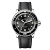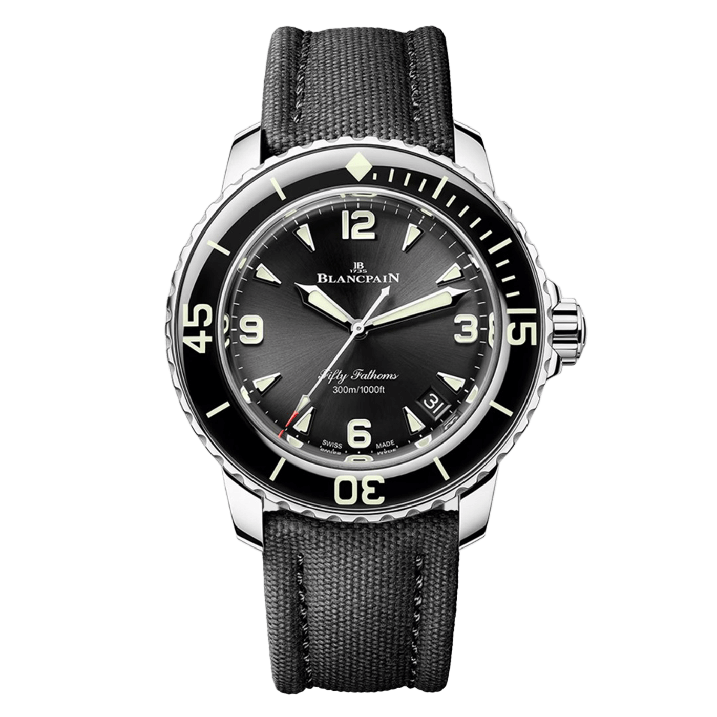 The Blancpain Fifty Fathoms Automatique 5010-1130-B52B represents the perfect fusion of dive-ready function and Swiss luxury craftsmanship. This model is a modern expression of the original Fifty Fathoms, the watch that defined professional diving timepieces in the 1950s. Built with a 42.3mm stainless steel case, it strikes a refined balance between presence and comfort. The brushed and polished surfaces give the watch an understated elegance, while its professional-grade specifications ensure it's ready for the most demanding environments. Its Sunburst Black Dialoffers excellent contrast, with oversized Super-LumiNova® hour markers and hands that glow bright in low light or underwater conditions. The Dial also features a neatly integrated date display between 4 and 5 o'clock—visible when needed, yet subtle enough not to distract from the watch’s clean layout. Surrounding the Dial is a unidirectional rotating bezel, fitted with a black ceramic insert and Liquidmetal™ numerals that resist fading and scratching, making it both aesthetically sharp and practically resilient. Powering this timepiece is the in-house Blancpain Caliber 1315, an automatic movement engineered for performance and reliability. It delivers a remarkable 120-hour (5-day) power reserve, supported by three barrels working in series, and is protected against magnetic interference thanks to its silicon balance spring. The movement is visible through the sapphire crystal caseback, revealing its meticulous finishing and the 18k gold rotor, coated in a dark NAC finish for a modern look. Built to withstand the rigors of deep diving, the watch is water-resistant to 300 meters (1,000 feet) and comes equipped with a black sail-canvas strap, a rugged yet comfortable material inspired by maritime traditions. The strap is fitted with a stainless steel folding clasp, providing a secure and adjustable fit whether worn over a wetsuit or directly on the wrist. Altogether, the Fifty Fathoms 5010-1130-B52B is more than just a tool watch—it’s a luxury timepiece that honors a rich legacy of underwater exploration while standing out in everyday wear.