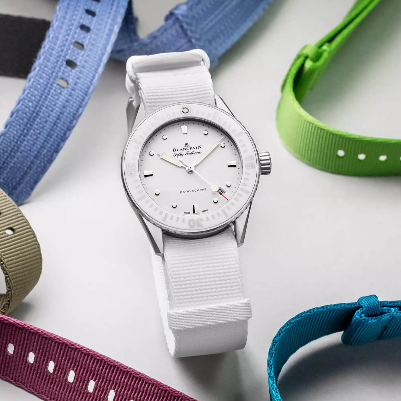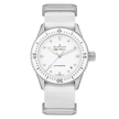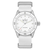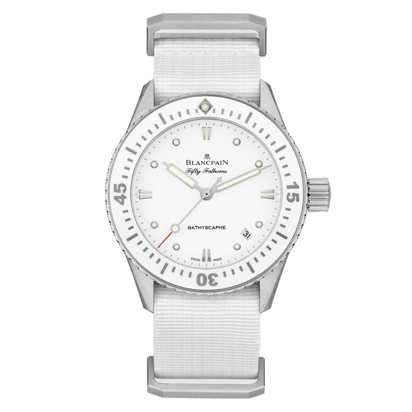 The Blancpain Fifty Fathoms Bathyscaphe Ref. 5100-1127-NAWA is a refined embodiment of the brand's storied diving heritage, seamlessly blending technical sophistication with understated elegance. Encased in a 38mm satin-brushed stainless steel case, this timepiece offers a versatile size that caters to a wide range of wrist profiles, making it an ideal choice for both seasoned divers and horology enthusiasts. The unidirectional bezel, crafted from steel with a white ceramic insert and Liquidmetal™ hour markers, ensures precise timing capabilities while resisting the rigors of deep-sea exploration. At its core lies the ultra-slim Blancpain Caliber 1150, an automatic movement renowned for its reliability and precision. Comprising 210 components and 28 jewels, this movement operates at a frequency of 3 Hz and boasts an impressive 100-hour power reserve, minimizing the need for frequent winding. The incorporation of a silicon balance spring enhances resistance to magnetic fields and temperature variations, ensuring consistent performance in diverse environments. The movement is visible through a sapphire case back, allowing a glimpse into the meticulous craftsmanship that defines Blancpain's watchmaking excellence. The Dial, presented in a pristine white hue, exudes a sense of purity and sophistication. Luminous hands and hour markers provide optimal legibility in low-light conditions, a critical feature for underwater navigation. The inclusion of a discreet date window at 4:30 adds functionality without disrupting the Dial's clean aesthetic, emphasizing the watch's commitment to functional purity. Protected by a scratch-resistant sapphire crystal, the Dial remains pristine even under challenging conditions. Completing the timepiece is a durable white NATO strap, secured with a stainless steel pin buckle, offering both comfort and resilience. With a water resistance of up to 300 meters (30 bar), the Fifty Fathoms Bathyscaphe Ref. 5100-1127-NAWA stands as a testament to Blancpain's dedication to creating watches that are as capable beneath the waves as they are elegant on land. This model encapsulates the brand's commitment to innovation, tradition, and the art of fine watchmaking.