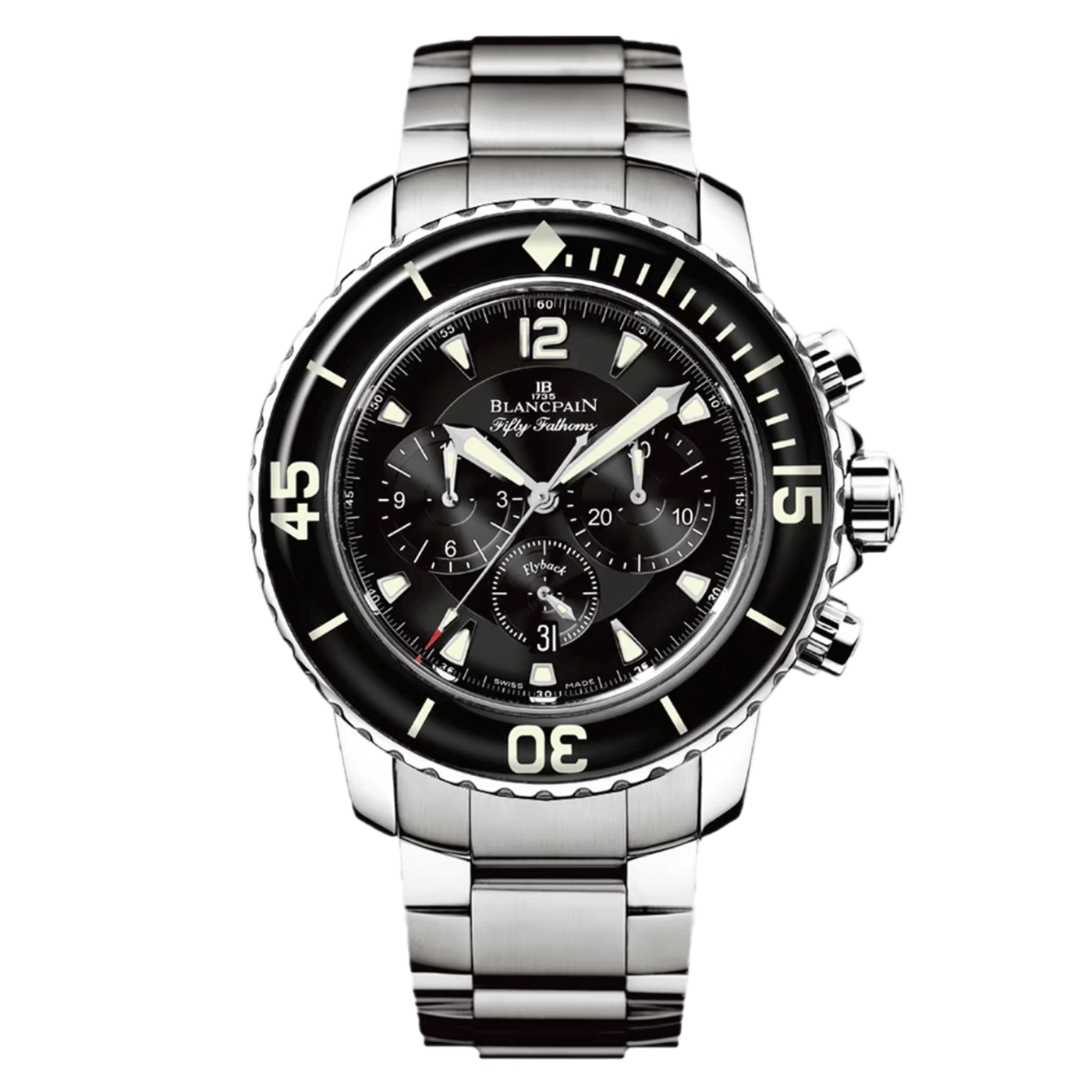 The Blancpain Fifty Fathoms Chronographe Flyback 5085F 1130 71S merges professional diving capabilities with Blancpain’s mastery of high-end mechanical watchmaking. As a continuation of the legendary Fifty Fathoms line, this chronograph brings an added layer of performance for timing critical intervals both above and below the surface. With a strong presence and refined detail, it’s built for precision and adventure alike. The watch features a 45 mm stainless steel case with a satin-brushed finish and a sapphire-capped unidirectional bezel for measuring dive time. The black Dial is clean and highly legible, featuring bold luminous hands and markers along with three sub-Dials for the chronograph: 30-minute and 12-hour counters, and a central seconds hand. A discreet date display is positioned between 4 and 5 o’clock. Engineered to be water resistant to 300 meters, it is a fully capable diving instrument. Powering the timepiece is the Blancpain Caliber F185, an automatic chronograph movement with a flyback function, allowing for quick reset and restart with a single push. The movement features a 40-hour power reserve and is visible through the sapphire case back, showcasing Blancpain’s attention to fine finishing. Paired with a stainless steel bracelet and folding clasp, the watch delivers comfort, strength, and a cohesive look for both sport and style.