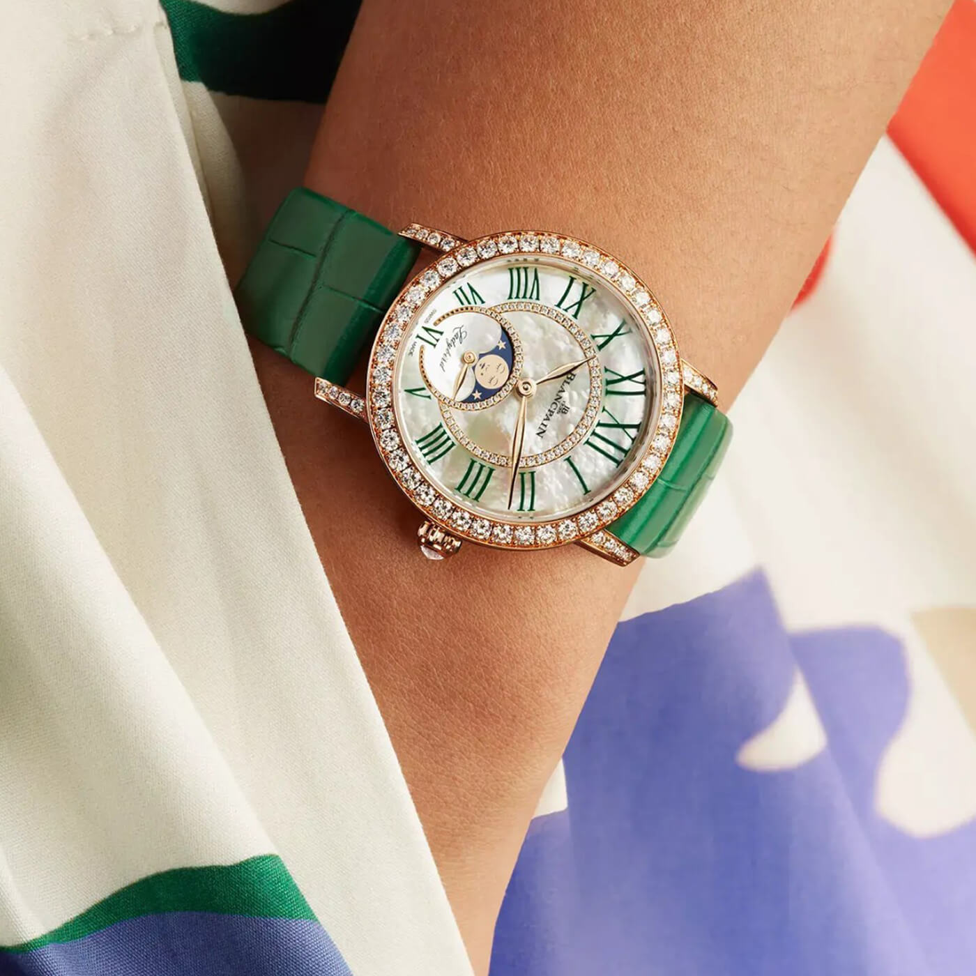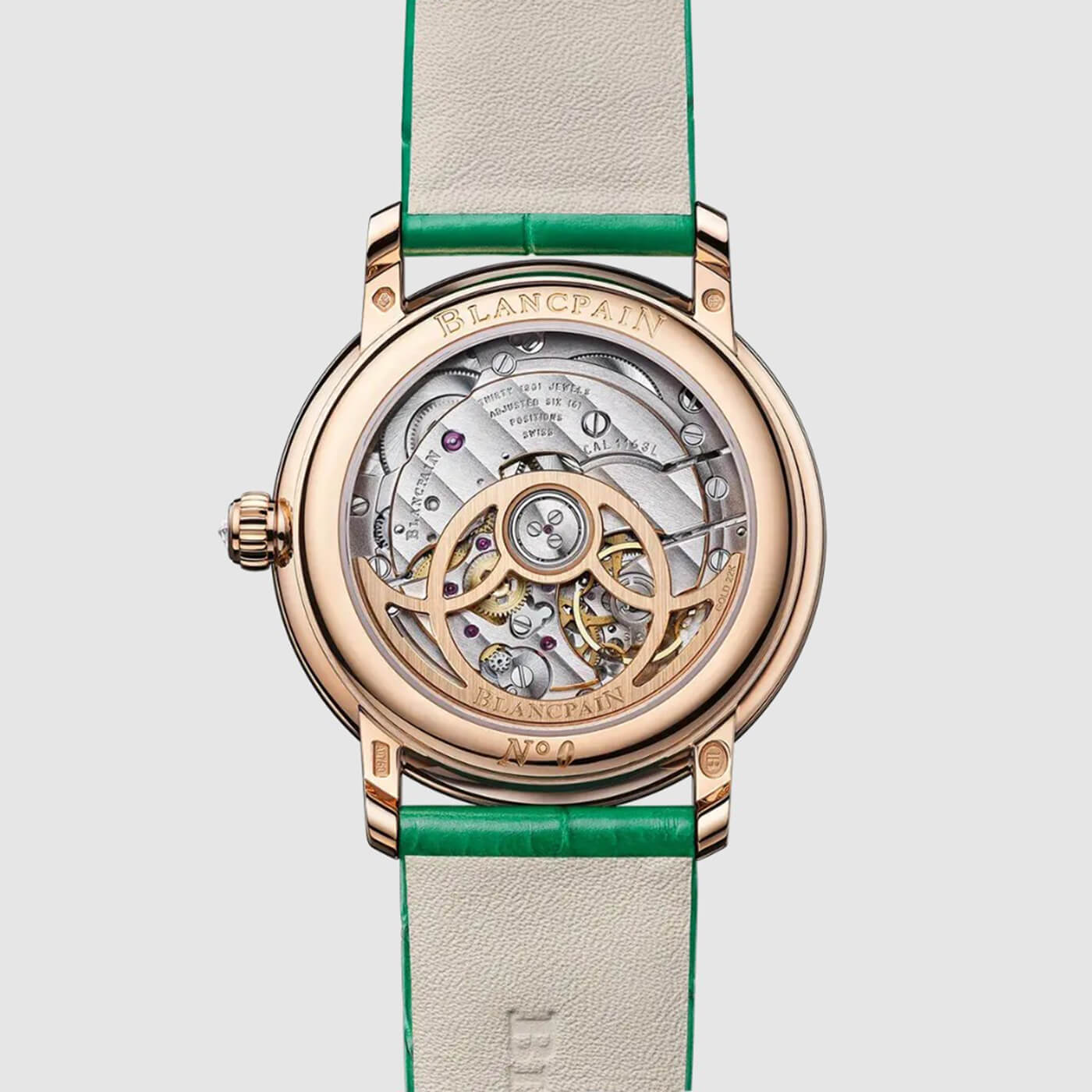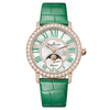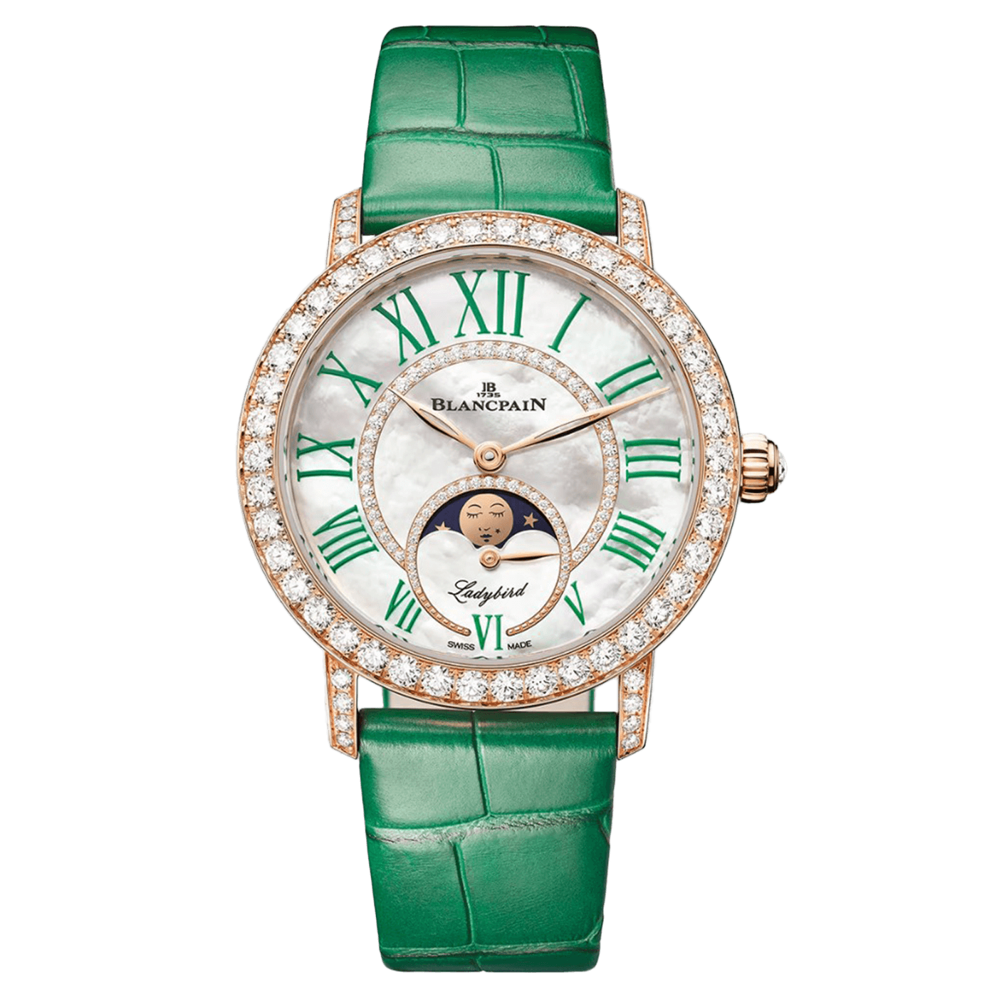 The Blancpain Ladybird Colors Phases de Lune (Ref. 3662B 2954 55B) is a brilliant embodiment of feminine watchmaking elevated through color, craftsmanship, and complexity. A proud member of the Ladybird Colors collection, this model captures the spirit of confident elegance with a harmonious blend of haute horlogerie and modern flair. Encased in 34.9 mm of 18K red gold, the timepiece is encircled by a bezel set with 59 brilliant-cut diamonds totaling approximately 1.48 carats, lending an exquisite radiance that enhances the warmth of the precious metal. The Dial, crafted from luminous white mother-of-pearl, glows with organic iridescence, providing a serene canvas for the poetic moonphase display positioned at 6 o’clock. A serpentine date hand sweeps gracefully along the periphery, complementing the celestial complication with whimsical sophistication. The diamond hour markers, polished red gold hands, and refined case geometry all reflect Blancpain’s dedication to timeless feminine elegance. Within, an expertly finished self-winding mechanical movement, produced entirely in-house, ensures precision and longevity. Visible through the sapphire crystal case back, the movement showcases fine hand decoration and features a red gold oscillating weight delicately engraved with the Blancpain motif. What sets this reference apart is its bold and graceful use of color: a vibrant green alligator leather strap, richly saturated and finely textured, offers a contemporary contrast to the warm hues of the red gold case. Paired with a matching red gold Folding Clasp, the strap enhances the watch’s refined yet expressive personality. The Ladybird Colors Phases de Lune 3662B 2954 55B is a tribute to the modern woman—confident, refined, and unapologetically unique. It unites poetic complications with bold chromatic expression, creating a timepiece that is not only mechanically accomplished, but emotionally resonant—a jewel of time to be worn and treasured.