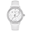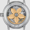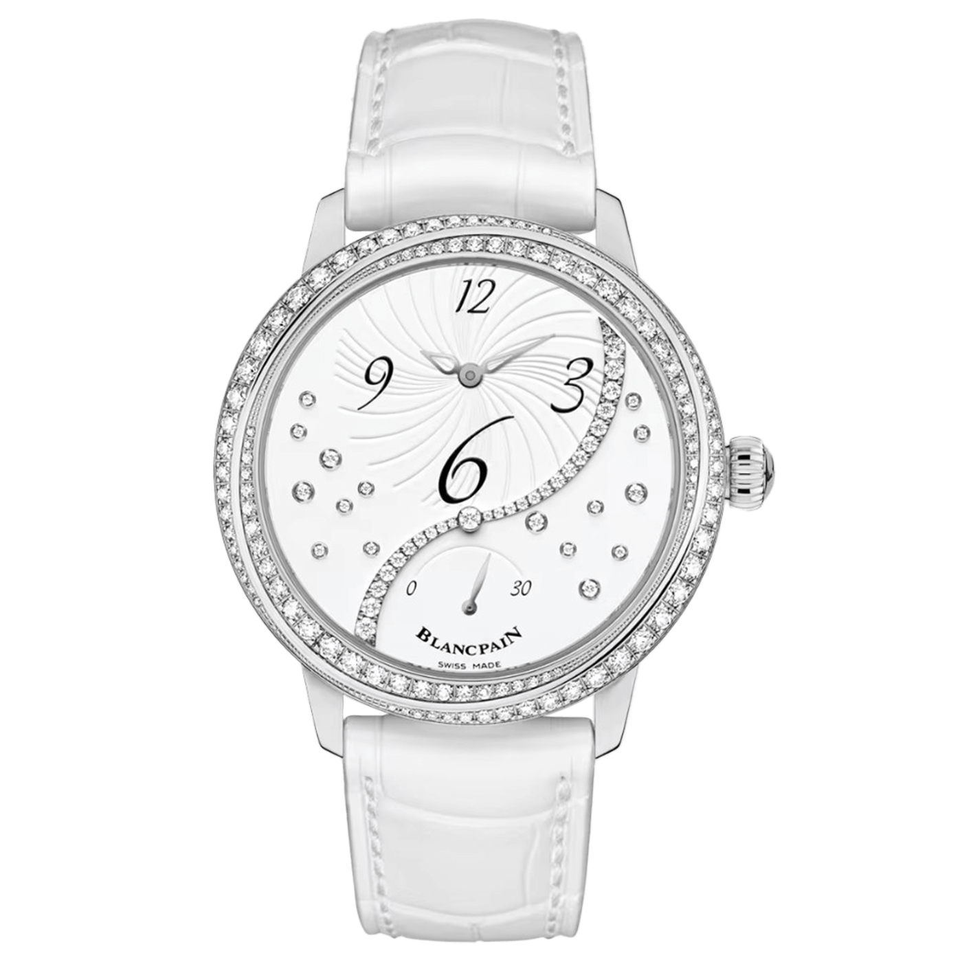 The Blancpain Heure Décentrée (Ref. 3650A 4528 55B) is a striking blend of avant-garde design and timeless elegance, crafted for those who appreciate a bold yet refined expression of watchmaking. Encased in 36.8 mm of polished stainless steel, this automatic timepiece features a bezel adorned with brilliant-cut diamonds, offering a luminous frame that enhances its graceful silhouette. The standout feature of this model is its decentered Dial layout, a signature of Blancpain’s creative artistry. The hours and minutes subDial, slightly offset from the center, creates a dynamic visual balance, while the Arabic numerals are playfully arranged in an asymmetrical arc—adding character and charm to the watch face. The white Dial itself is further elevated by a delicate sprinkling of diamond hour markers, enhancing its radiant presence with refined sparkle. At the heart of the timepiece is a self-winding mechanical movement, expertly crafted in-house to ensure reliability and precision. The movement is visible through the sapphire crystal case back, revealing the intricate finishing that underscores Blancpain’s horological mastery. A white alligator leather strap completes the composition, secured by a stainless steel folding clasp, offering both comfort and elegance. The Heure Décentrée 3650A 4528 55B is a celebration of design innovation, luxurious detailing, and exceptional watchmaking.