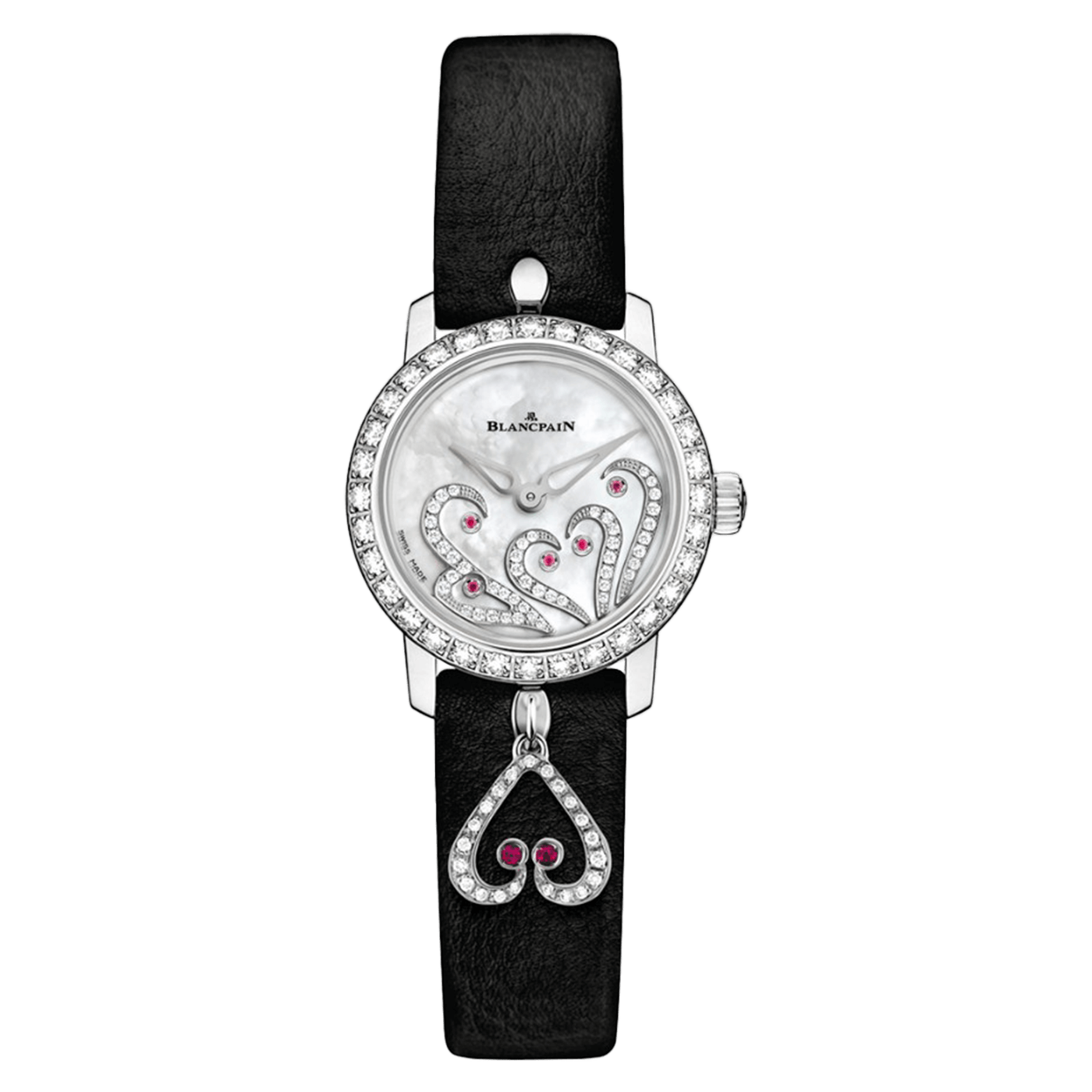 he Blancpain Ladybird Ultraplate (Ref. 0063B 1954 63A) is a graceful union of horological finesse and timeless feminine elegance. Crafted in polished 18K white gold, its delicate 21.5 mm ultra-slim case is encircled by a bezel set with 32 brilliant-cut diamonds, totaling approximately 0.59 carats. Each diamond is meticulously hand-set, creating a luminous frame that highlights the watch’s refined proportions and sparkling presence. What sets this reference apart is the addition of a heart-shaped charm pendant, delicately suspended from one of the lugs—a poetic and symbolic detail that adds movement, warmth, and emotional depth. This precious charm serves as a subtle yet powerful reminder of affection, femininity, and timeless love, making the timepiece not only a statement of style, but of sentiment. The Dial is fully pavé-set with brilliant-cut diamonds, offering a seamless canvas of light and brilliance. In the absence of hour markers, slender leaf-shaped white gold hands glide effortlessly across the surface, allowing the artistry of the gem-setting to take center stage. Inside, the watch houses a manually wound mechanical movement developed entirely in-house by Blancpain. Visible through the sapphire crystal case back, the movement is finely finished with Côtes de Genève and traditional hand-decoration, offering a glimpse into the craftsmanship that powers this miniature marvel. Completing the watch is a sleek black leather strap, smooth and understated, which contrasts beautifully with the brilliance of the case and Dial. The strap is secured by a white gold pin buckle, ensuring both comfort and elegance on the wrist. The Ladybird Ultraplate 0063B 1954 63A is more than a timepiece—it is a jeweled expression of grace, emotion, and refined Swiss watchmaking. With its radiant diamond Dial, ultra-slim profile, and signature heart charm, it embodies a quiet sophistication and heartfelt beauty meant to be treasured for generations.