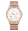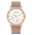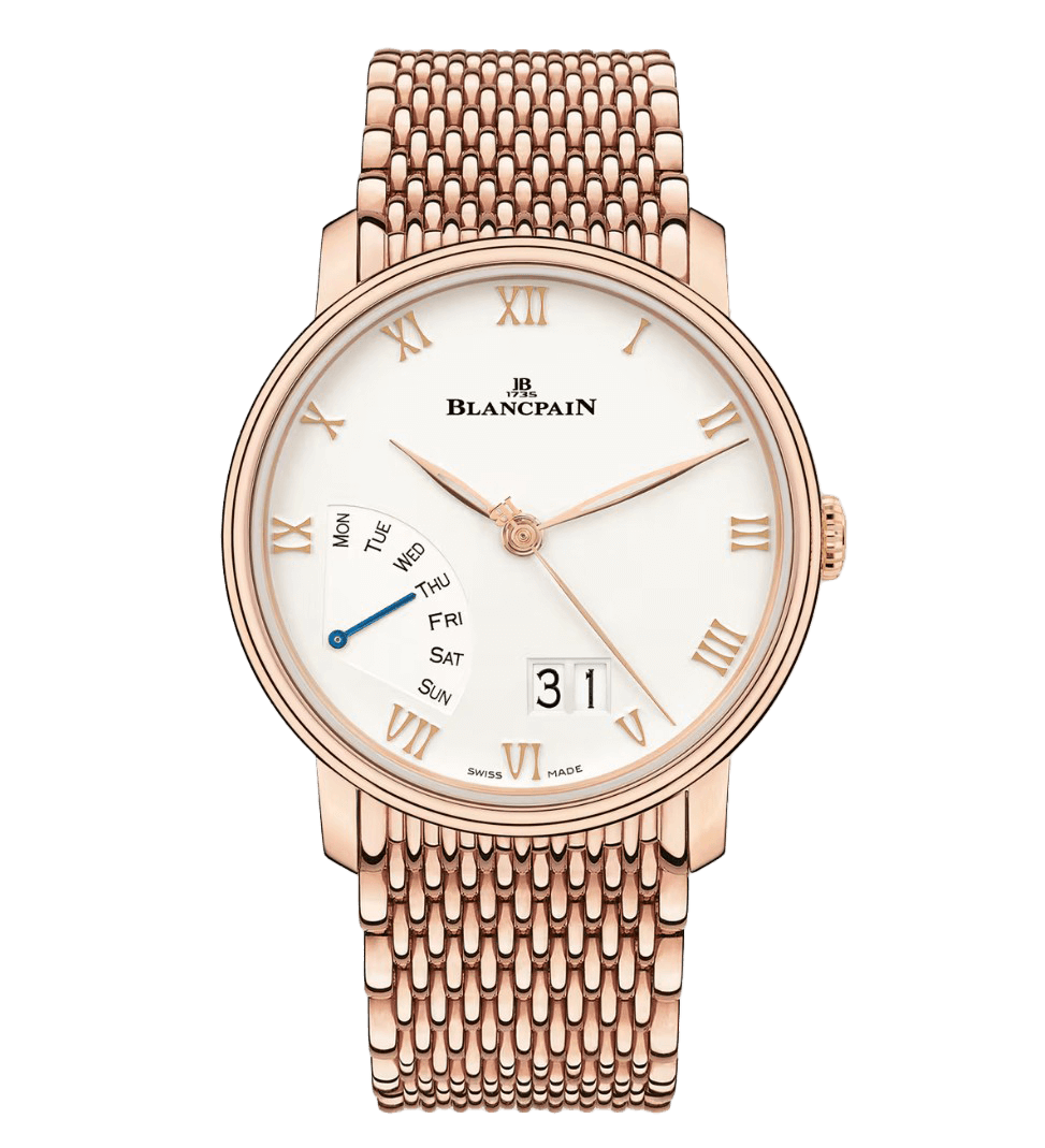 The Blancpain Villeret Grande Date Jour Rétrograde 6668?3642?MMB is a remarkable fusion of classic elegance and functional sophistication. Its 40.5?mm polished 18k red-gold case is beautifully paired with a Mille Mailles red-gold mesh bracelet, creating a seamless and luxurious presence. The clean opaline dial showcases applied Roman numerals and slender leaf-shaped hands, accompanied by a large double-aperture date at 6 o’clock and a retrograde day display elegantly traced with a blued-steel hand between 7 and 9 o’clock—offering practical information without disrupting harmony. Inside, this timepiece is powered by Blancpain’s in-house automatic Caliber 6950GJ.4, a compact yet powerful movement measuring just 5.27?mm thick. Running at a frequency of 4?Hz with twin barrels and a silicon balance spring, it provides a robust 72-hour power reserve. The movement features advanced features like a vertical clutch and safety mechanism, and comprises 344 components and 40 jewels. Its exceptional finishing—Geneva stripes, polished bevels, and perlage—is visible through the transparent sapphire case back. Altogether, the 6668?3642?MMB stands as a fine example of horological artistry, offering a dress watch that delivers both visual elegance and mechanical nuance.
