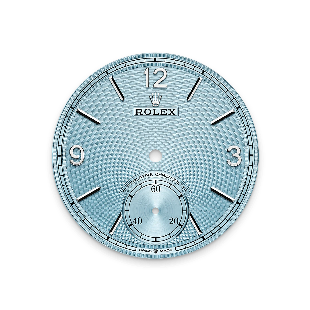 The ice blue dial features a guilloche rice-grain motif. This rosette-like design is distinctive for its three-dimensional, repeating geometric pattern that extends across the surface of the dial starting from the small seconds counter at 6 o’clock. The minute track around the dial is flanked by a finely crimped guilloche-work border. With the introduction of a dial created via guillochage, or engine turning – a technique that uses a graver to sculpt a pattern into a surface – Rolex is pursuing the course it has set for the Perpetual collection as a tribute to the classic art of watchmaking infused with the brand’s know-how and creativity. This exclusive dial bears the same Arabic numerals 3, 9 and 12, the same faceted hour markers and the same hands as that of the 18 ct gold versions. This exclusive dial colour can be found only on the Day-Date, the Cosmograph Daytona and the Perpetual 1908.
