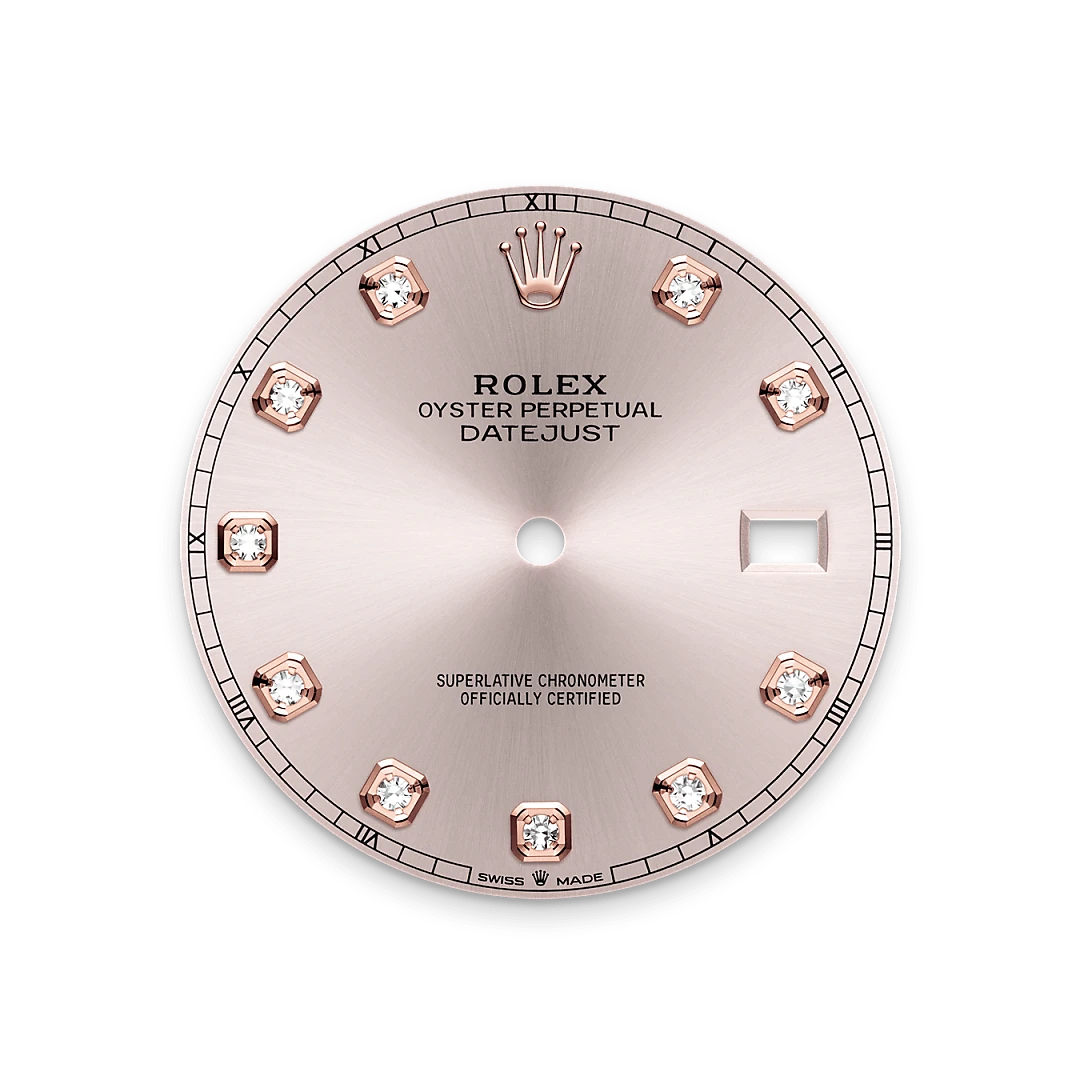This dial features diamonds in 18 ct gold settings. The sunray finish creates delicate light reflections on many dials in the Oyster Perpetual collection. It is obtained using masterful brushing techniques that create grooves running outwards from the centre of the dial. Light is diffused consistently along each engraving, creating a characteristic subtle glow that moves depending on the position of the wrist. Once the sunray finish has been completed, the dial colour is applied using Physical Vapour Deposition or electroplating. A light coat of varnish gives the dial its final look.